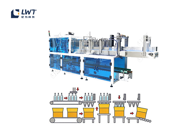 ? 自動化程度高:可根據預設的產品箱數要求,自動完成產品整理、排列、跌落裝箱等工序,裝箱后的產品自動送入輸送滾筒,無需人工干預,有效減少人力成本,避免人為操作誤差。