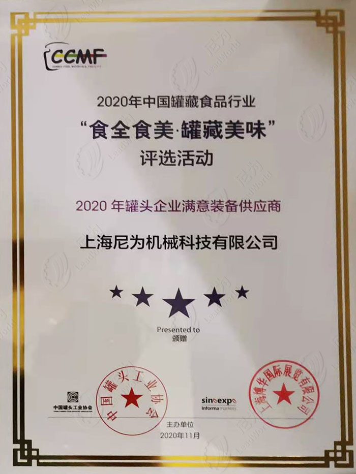 尼為榮獲“2020年罐頭企業(yè)滿意裝備供應(yīng)商”