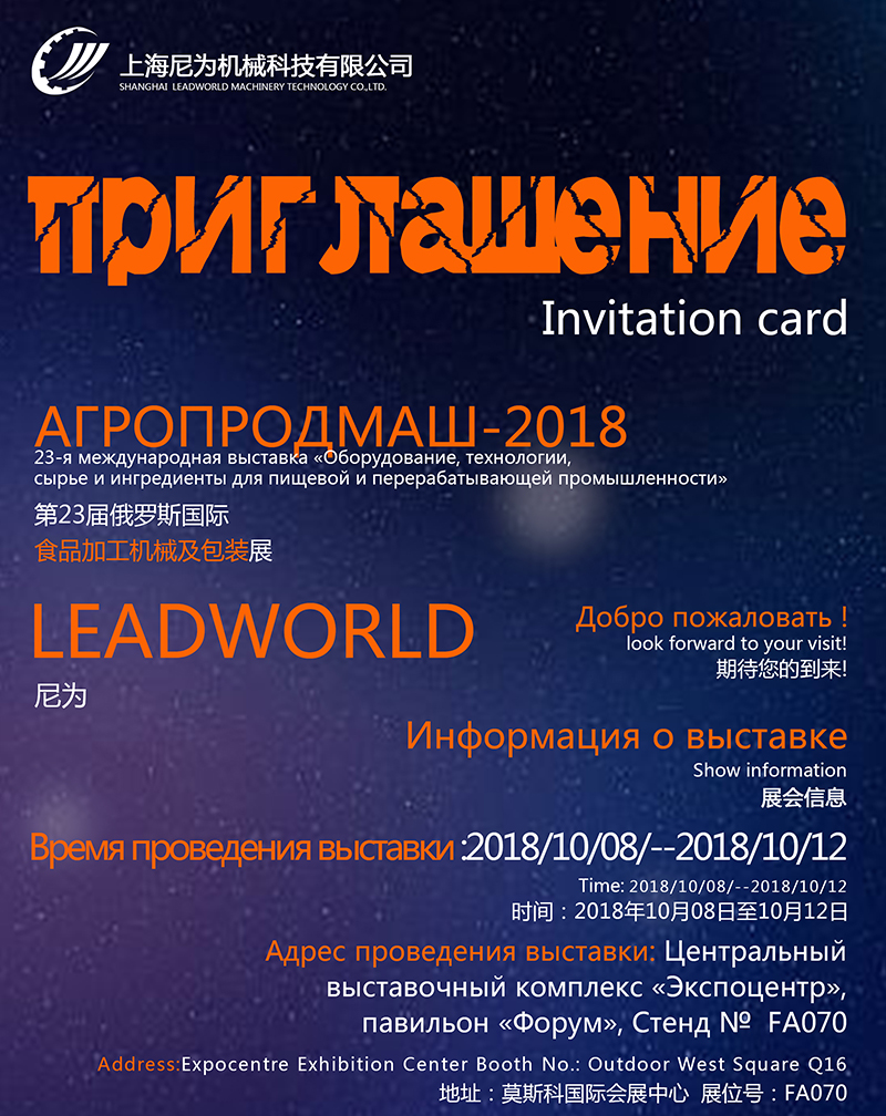 上海尼為機(jī)械科技有限公司誠(chéng)意邀請(qǐng)您參觀將于2018年第23屆俄羅斯國(guó)際食品加工機(jī)械及包裝展-AGROPRODMASH